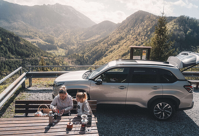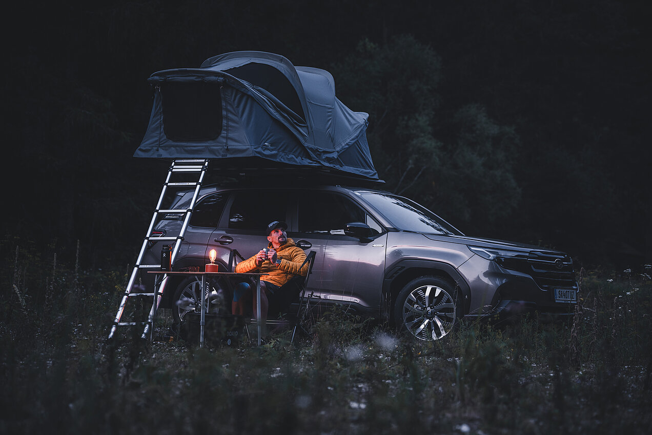 Gerald setzt bei seiner Flucht in die Natur auf einen Subaru Forester. Denn wer sowohl im Sommer als auch im Winter abseits der ausgetretenen Pfade unterwegs sein will, braucht Verlässlichkeit und gerne auch mal Allrad-Performance. Außerdem bietet der Subaru Forester ausreichend Platz für Fahrrad, Ski- und Bergausrüstung, aber auch für die Familie, die Gerald immer wieder auf seinen Abenteuern begleitet. Die passt zwar gesammelt nicht in das Dachzelt, das Gerald auf seinem Forester mitführt, aber auch hier bietet der Forester genug Platz, dass zumindest auf „zwei Etagen“ alle untergebracht werden können.
